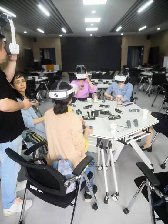 会后,黄院长带领两院的马原组教师体验了球王会平台的生命长江虚拟仿真教学体验中心。徐骆给老师们介绍了3D大屏游览红色景点和VR一体式头盔开展思政主题应用的交互体验。随后,老师们体验了《VR长征史诗》中的“爬雪山”“过草地”等场景。并就马原课程与VR相结合的途径和前景进行了讨论。