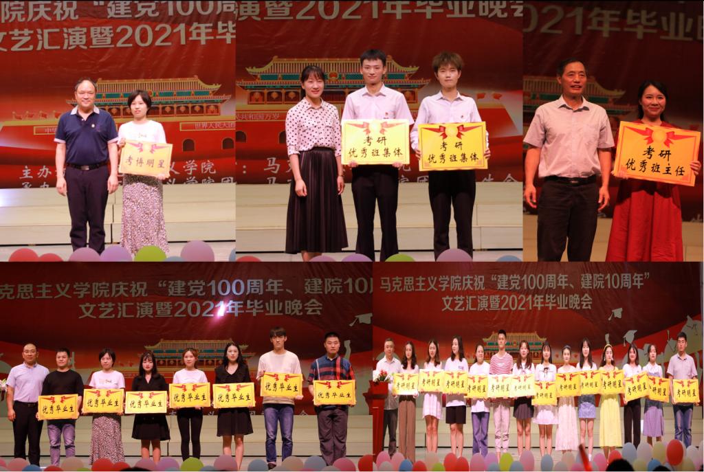 晚会首先对学院2021年考研先进集体和个人、优秀毕业生进行表彰,激励师生珍惜韶华,不负青春,锤炼本领,报效祖国。“征途漫漫,惟有奋斗”,教师代表李振华鼓舞同学们走出舒适圈,拒绝“躺平”,接续奋斗。毕业生代表罗金用“见证、成长、记忆”向大学时光告白。