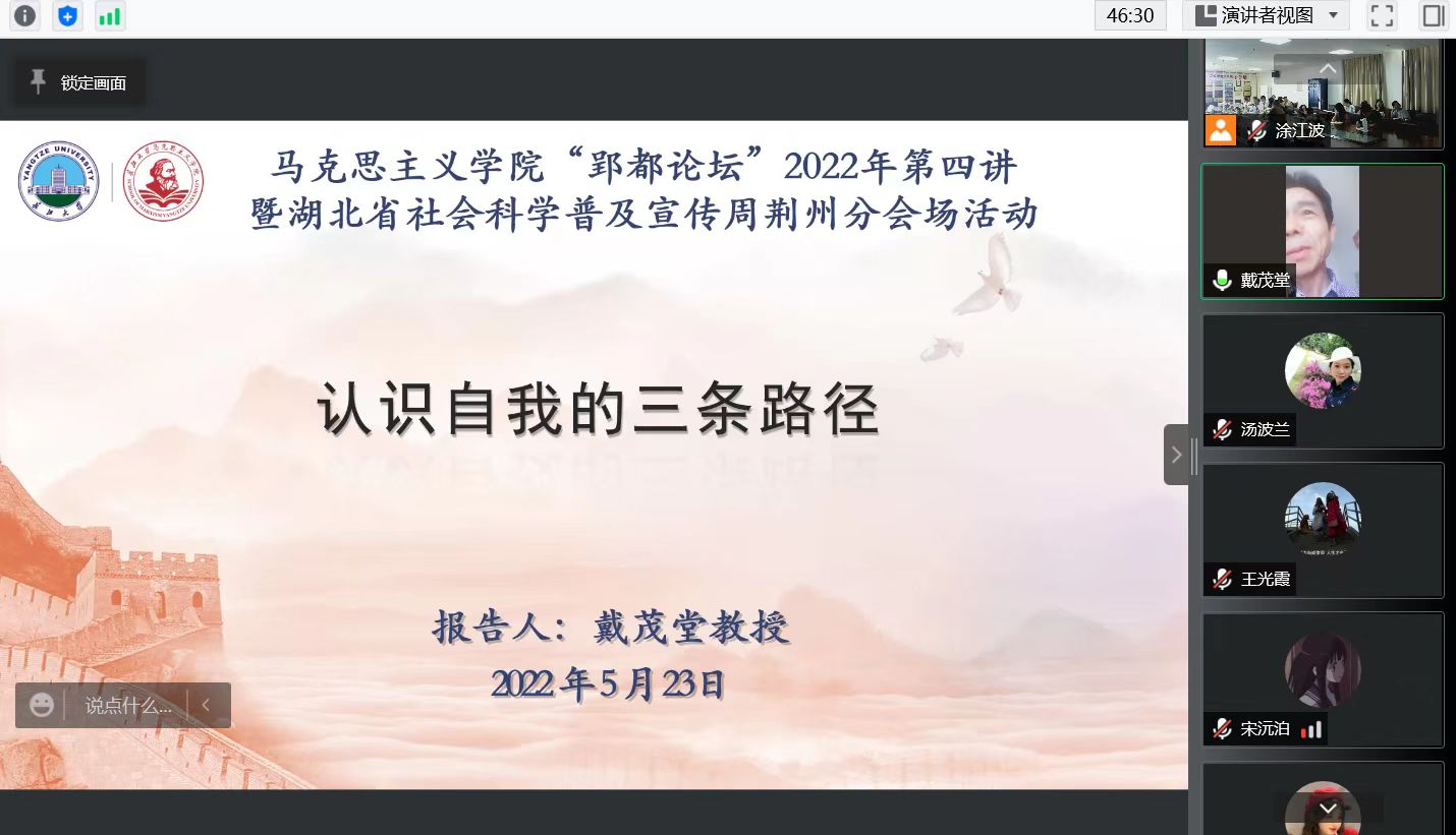 (通讯员 马梦甜)知人者智,知己者明。2022年5月23日上午9点整,北京师范大学哲学国际中心教授戴茂堂为球王会平台,球王会网站师生带来一场题为《认识自我的三条路径》的讲座。本次讲座由球王会平台,球王会网站副院长、教授涂江波主持,以线上线下相结合的方式进行。
