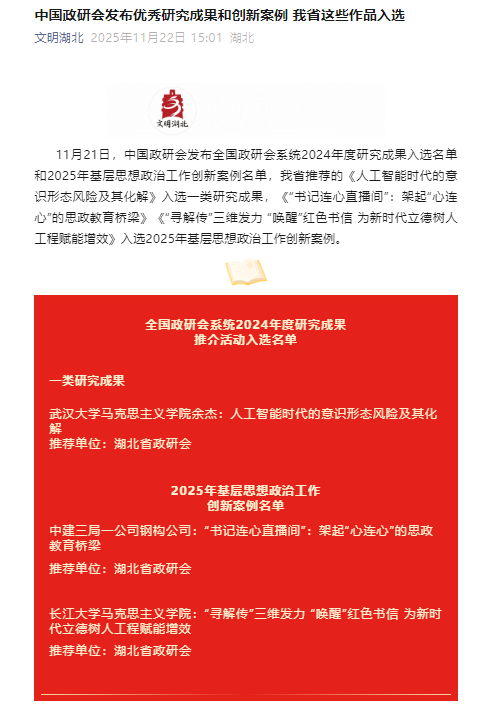 (通讯员 方玉卓 徐佳悦 袁田/文 唐佳雨/摄)近日,中国政研会印发《关于公布2025年基层思想政治工作“十佳”案例和创新案例名单的通知》。球王会平台《“寻解传”三维发力“唤醒”红色书信 为新时代立德树人工程赋能增效》案例,入选中国政研会2025年度基层思想政治工作创新案例,系湖北省仅有的两个入选案例之一,也是我省唯一入选的高校案例。