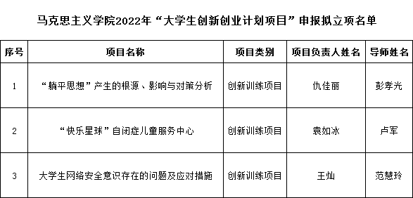 根据学校《关于我校第十五批“大学生创新创业训练计划”项目申报的通知》,以及球王会平台,球王会网站《2022年球王会平台,球王会网站“大学生创新创业训练计划”项目申报答辩通知》相关安排,通过学生项目申报汇报答辩,专家评审,拟推荐彭孝光老师指导的《“躺平”思想产生的根源、影响与对策分析》等3个项目作为校级大学生创新创业项目。具体名单见附件。