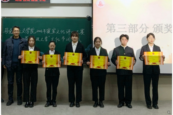 风采展示完成后,活动进入点评和颁奖环节。张志超老师点评时说:“因为文化因为美我们聚在一起,对美的追求是一场精神的跋涉,感谢你们让我看见用精神铸就的青春风采。你们对美的追求和表达,不是象牙塔的居所,而是同窗友谊的摇篮。”刘书记对今晚的寝室风采展给予了极大的肯定:有才、有料、有趣、有爱。“同学们的表现充满智慧、青春、快乐、温暖的气息,给了我感动感怀感想感化。”经各位评委评比打分,由马小佼、彭孝光、王贤锋分别为一等奖、二等奖、三等奖获得者颁奖并合影留念。