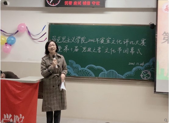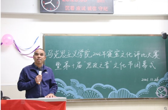 最后,刘小燕书记对第十届“思政之音”文化节进行总结回顾并致闭幕词。“思政之音文化节促使马院学子增强专业理论学习,激励马院学子树立远大理想,勉励马院学子践行初心使命。”正如刘书记所言,第十届思政之音文化节在继承往届成功经验的基础上,不断完善活动细节,不断提高活动质量。思政学子不仅心中有党信仰坚定,实践活动中更是时刻锻炼能力素养,爱党爱国。第十届思政之音文化节虽然定格于今晚,但其中的精神食粮却不断滋养着马院师生继承弘扬伟大建党精神,顽强奋斗、不懈奋斗,共同书写新的恢宏篇章。