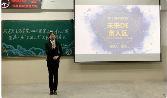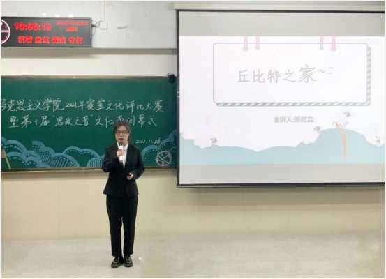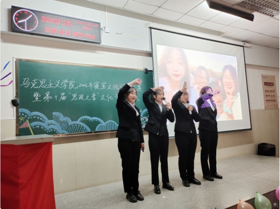 在主持人张圣文、王子怡简明扼要的介绍寝室答辩评比要求之后,寝室装饰评比大赛正式开始。首先由各寝室代表人员依次上台进行汇报展示,各寝室围绕“心宿暖阳,安寝无忧”这一主题从成员介绍、工作学习、文化装点、寝室关系等方面展开详细汇报,内容充实丰富、积极向上,形式创意满满、灵活多样,紧跟时代风向,紧扣时政热点,充分展示了马院学子的昂扬姿态。十个寝室的成员介绍个性鲜明、幽默风趣,学习、工作的身影遍布思政之音、运动会、志愿服务等各大活动组织,寝室装饰中的励志挂画、千纸鹤门帘、心灵寄语、照片墙、寝室公约等设计别出心裁,饱含马院学子脚踏实地仰望星空,逐梦人生熠熠生辉的憧憬。自编自导自演的情景剧《让emo飞》《反内卷》等独具创意,自学泰语、剪辑、书法、笛萧乐器的你们像星月一样闪闪发光。短短的五分钟展示了相知相遇相互扶持的温暖,展现了一群星光不负的赶路人。