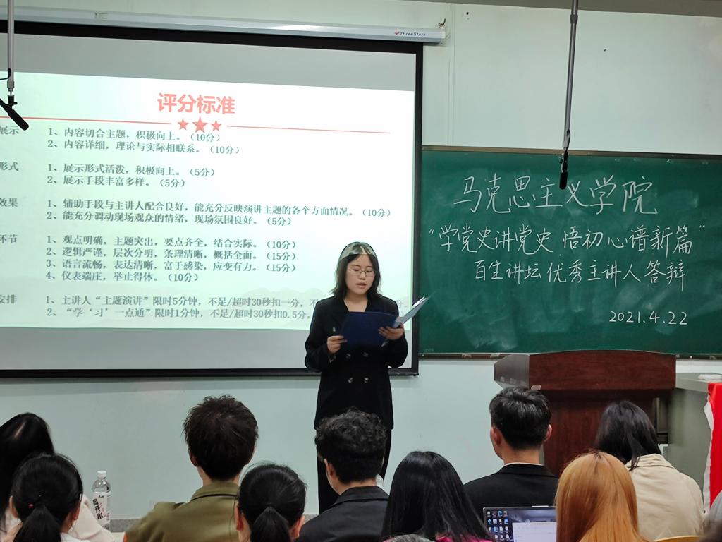 (通讯员 李春燕)学党史讲党史,悟初心谱新篇。 4月22日19:00,球王会平台,球王会网站“百生讲坛”优秀主讲人答辩活动于13教A203举行。本次活动邀请辅导员李敏、团委学生会主席李懿宸、副主席魏文婵、莫保华和部分部长作为嘉宾评委。大一大二全体同学参加。