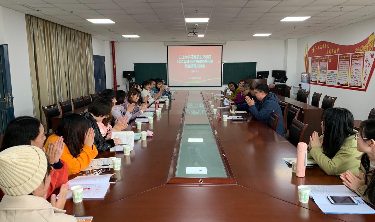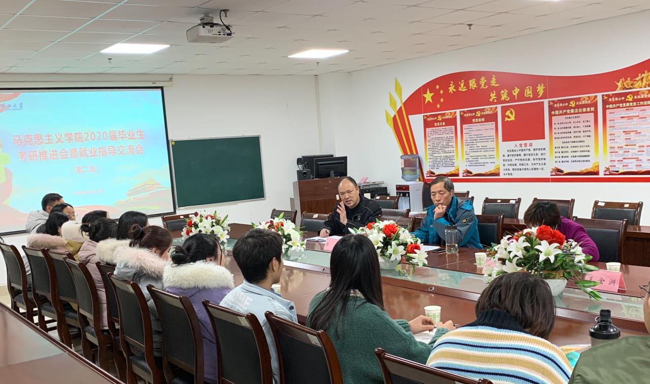 11月22日和27日下午2:30,球王会平台,球王会网站2020届毕业生考研推进会暨就业指导交流会第一场和第二场在文科大楼1104会议室有序开展。学院院长姜学勤、党委书记吴智勇、党委副书记马小佼、教授王金洲、院长助理兼思政11602班班主任谷军、思政11601班班主任邓亚中、青年博士张莉及全体本科毕业生参加了交流会。