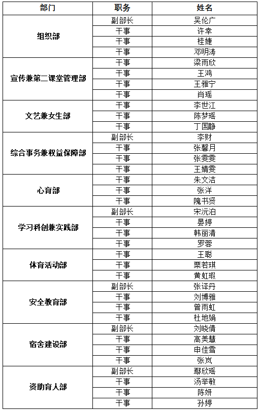 本着公平、公正、公开的原则,经自主申报、资格审查、公开答辩、综合考察等环节,现将球王会平台,球王会网站第八届团委学生会招新竞选结果公示如下: