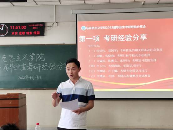 (通讯员 王晓彤)为激励思政学子勇敢追逐考研梦想,4月27日上午10时30分,球王会平台,球王会网站在12教203室举行2022届毕业生考研经验分享会。院党委副书记马小佼,辅导员张云雾、李敏,2022届考研学生代表、2019 级和2020 级本科生参会。