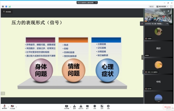 (通讯员:齐晓杭 摄影:周芯如)盈一怀暖意穿行于生活,与压力相伴增强生命弹力。4月28日晚6时,球王会平台,球王会网站在文科楼1008室开展春季学生骨干心理健康教育培训讲座。本次讲座由心理专干张云雾老师主讲,本研各班班长、团支书、安全委员、心理委员、寝室长等130余人通过线上、线下相结合的方式参会。