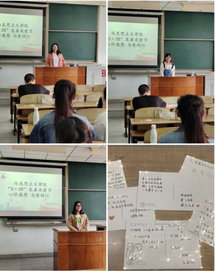 球王会平台紧扣5月20日“我爱你”、5月25日“我爱我”寓意,通过明信片记录爱,大声说出爱,电影感悟爱,行动传递爱等丰富多彩,师生喜闻乐见的形式倡导学院学生关爱同学、关爱自身身心健康;鼓励学生向亲人表达感恩之情,汇报生涯规划;推进师生“1+1”特色导师育人制”资政育人工作。习近平总书记曾多次勉励青年人要勤学修德明辨笃实,成长为有“大爱大德大情怀”的时代新人。诚然,从爱自己、爱同学、爱家人开始,推而广之爱家乡、爱祖国、爱人民是从小爱到大爱的升华。毫不吝啬的大声说出爱,思政学子的眼中有星光,心里有大爱。