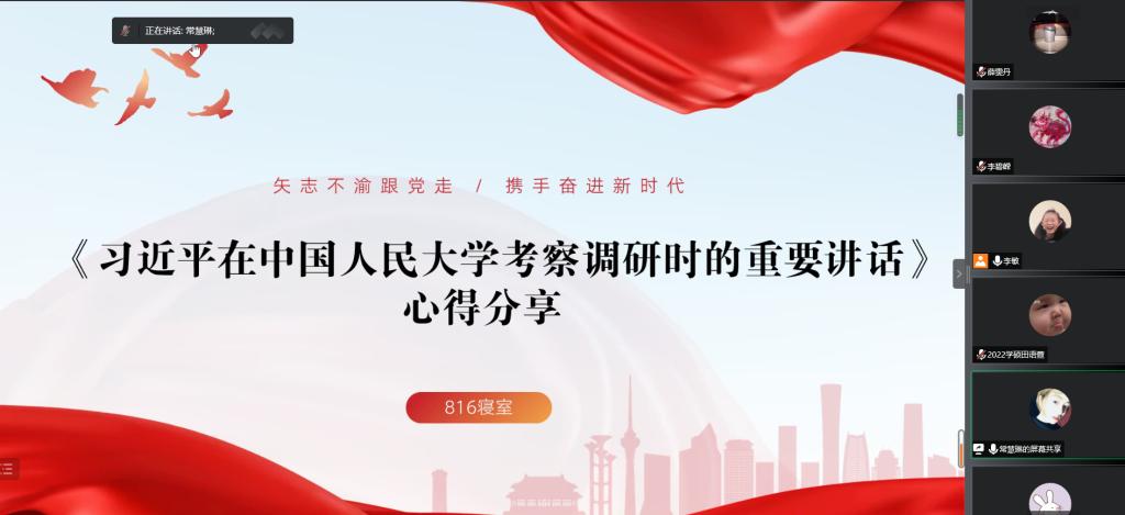 618寝室代表常慧琳同学从中国人民大学的创建历史出发,带领大家重温《习近平在中国人民大学考察调研时的重要讲话》,并就教育的根本问题、高校在教育中的作用、思政课的本质和培养教师队伍四个方面作了详细解说。分享最后她对同学们发出号召:“作为青年学生,我们要自觉、自省、自励、勤学、明辨、笃行,努力学习,提升理论素养、强实践锻炼、掌握过硬本领、用心感应时代脉搏,将青年使命贯穿学业”。