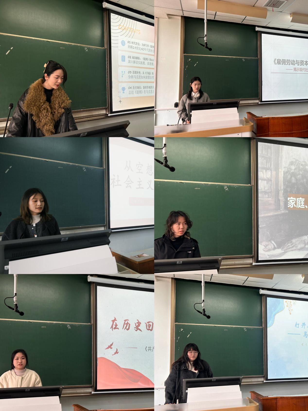 秦瑶窈同学聚焦《关于费尔巴哈的提纲》,带领大家梳理马克思主义哲学的核心要义,深入阐释实践观点的深刻内涵与时代价值;何知知同学解读《雇佣劳动与资本》,层层剖析资本主义生产关系的本质特征,引发同学们对劳动价值与阶级关系的深度思考;胡小雨同学分享《家庭、私有制和国家的起源》的阅读感悟,追溯人类社会发展的历史脉络,探讨文明演进的内在逻辑与发展规律;胡陈洪同学领学《共产党宣言》,重温这部无产阶级革命的伟大宣言,让在场师生进一步坚定共产主义理想信念;洪思齐同学解析《〈政治经济学批判〉序言》,系统阐释唯物史观的基本原理,帮助大家明晰人类社会发展的客观规律;陈梅芳同学分享《社会主义从空想到科学的发展》,梳理社会主义思潮的演进历程,深刻彰显科学社会主义的真理力量与实践伟力。